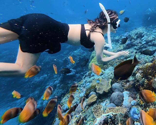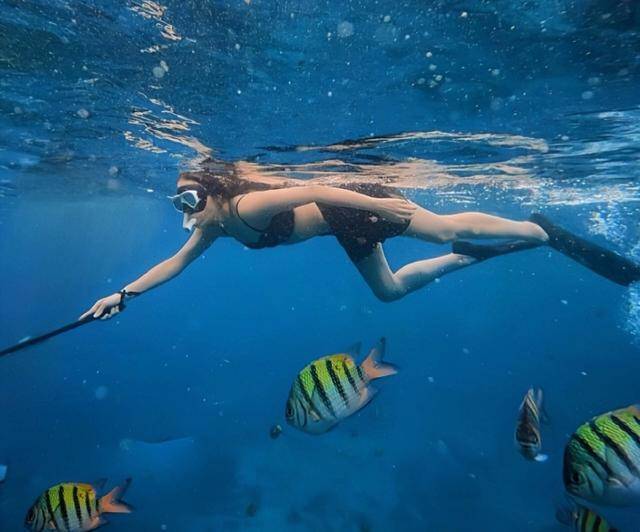 从网上曝光的照片可以看到,官恩娜穿着黑色的三点式泳装,四肢纤细、身材火辣,可以说少女感满满。她在海底潜水的照片,也是令网友羡慕不已。